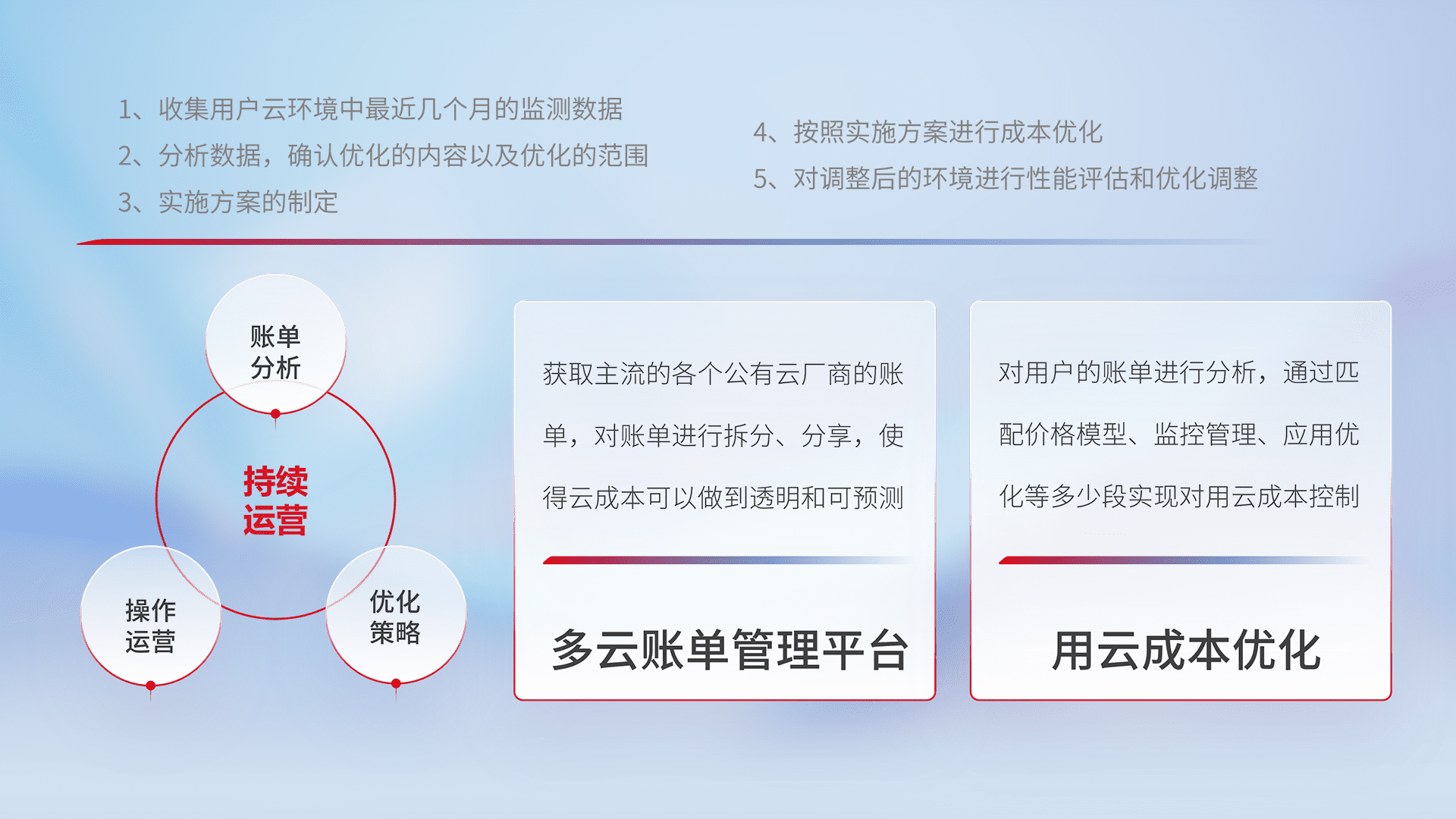 通过多云纳管,,,,以统一的资源数据模型把客户的云资源进行抽象和封装,,,进而实现对多云资源的统一操作,,保障云资源管理的可靠性、、稳定性与可用性。。。。量身定制化运维内容,,,,配置、、、开发运维、、补丁管理、、、、备份、、、、监控、、、认证和访问管理、、、、审计和日常巡检等,,,保障在用云过程中的可靠度,,,稳定度以及高可用率。。。。