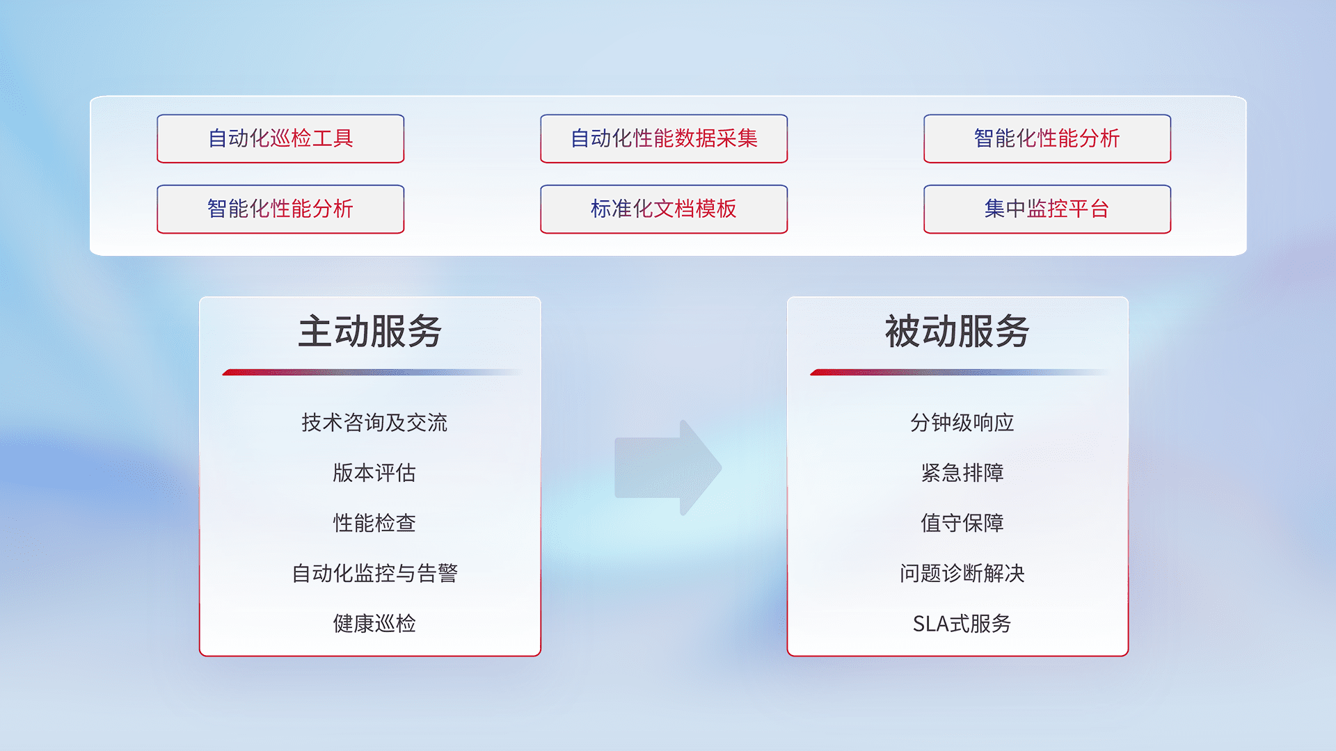 智能化工具和标准化文档,,,,保障服务质量,,,提供主动服务(包含技术咨询、、、版本评估、、、、性能检查、、、自动化监控与告警、、健康巡检)和被动服务包含(分钟级响应、、、紧急排障、、值守保障、、、、问题诊断解决、、SLA服务)。。。。